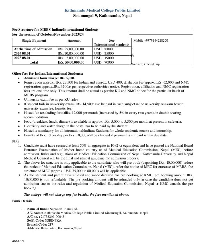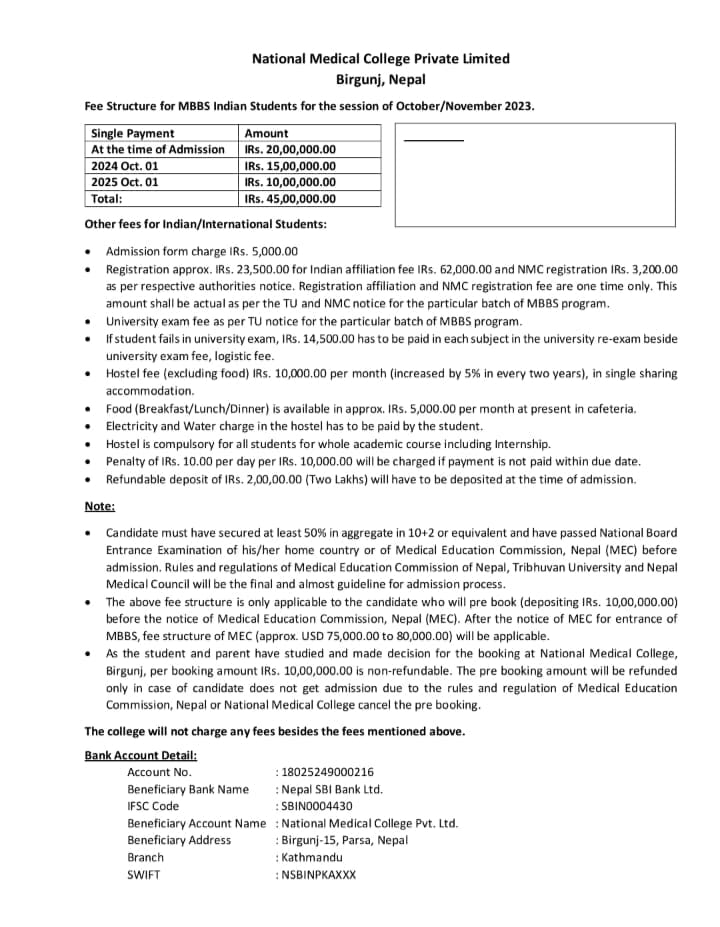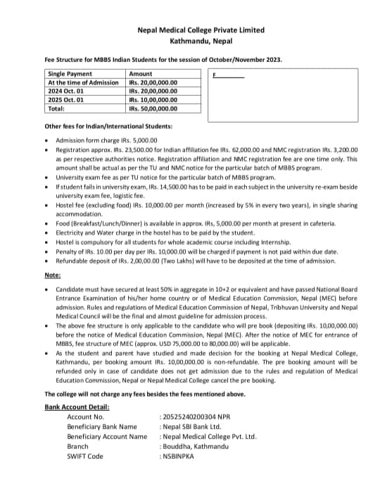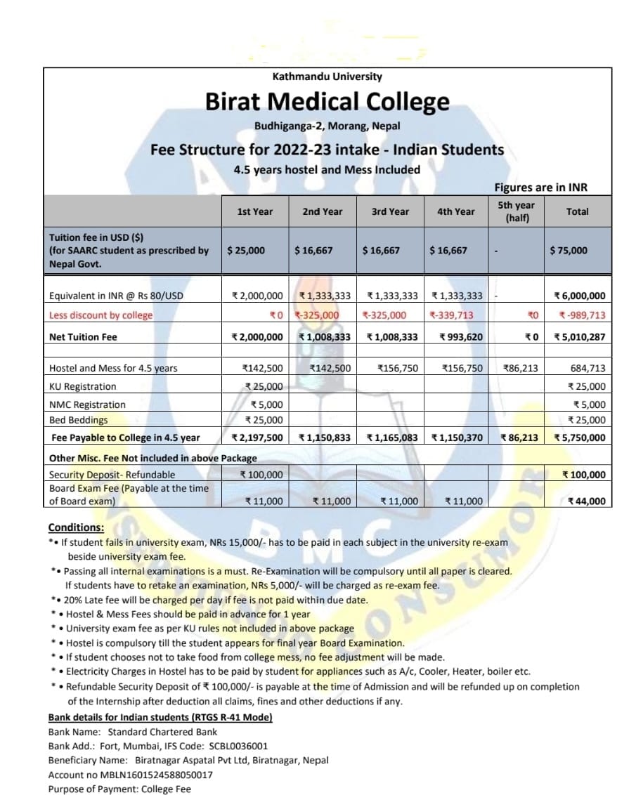 | Dhaka National Medical College, Dhaka | 2009 | Dhaka University | 48,000 USD | 30,000 USD Rest in 4 yr. payable Every month 300 USD from 1st month to last | 100 USD / month Food cost at actual |