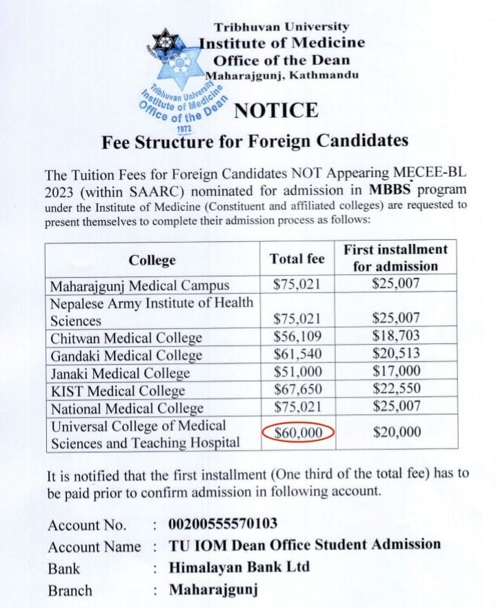 | Universal Medical College, Dhaka | 2013 | Dhaka University | 38,000 USD | 16,000 USD | Including hostel cost Food cost at actual |